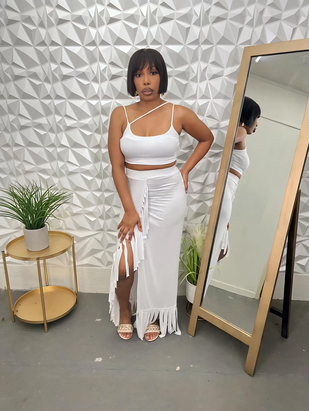 Indulge in the graceful simplicity of our "Serenity" 2-Piece Set. The white tube top and split skirt exude effortless elegance and flow beautifully on the body. Perfect for any occasion, this set will make you feel serene and chic.